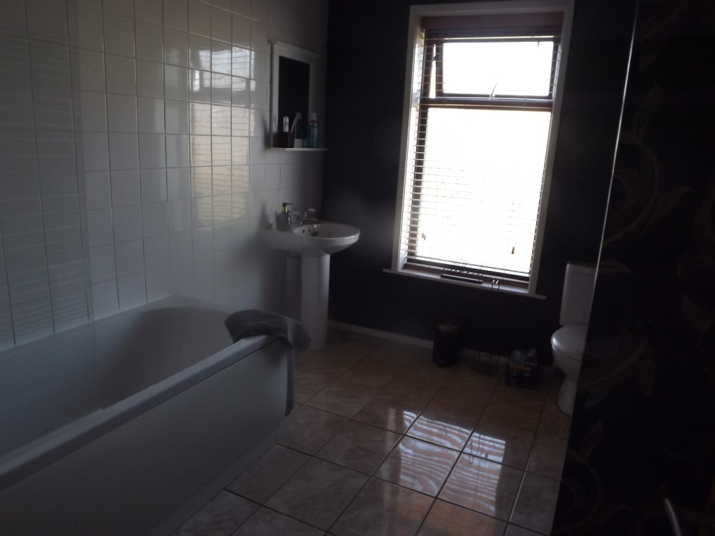 BATHROOM. Three piece suite in white with chrome fittings, incorporating panelled bath with shower over bath, glass shower screen, pedestal wash hand basin, low level w.c. ceramic tiled floor, part tiled walls, chrome heated towel rail, double glazed window to front.