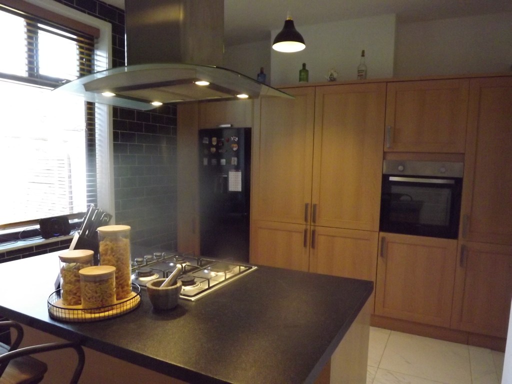 DINING KITCHEN. Superb fitted dining kitchen in Light Wood, breakfast bar, integrated fridge/freezer, dishwasher, washer, microwave, ceramic tiled floor, single drainer stainless steel unit with mixer taps, plumbed for automatic washer included, part tiled walls, central heating radiator, under stairs storage, 2 double glazed windows to rear.