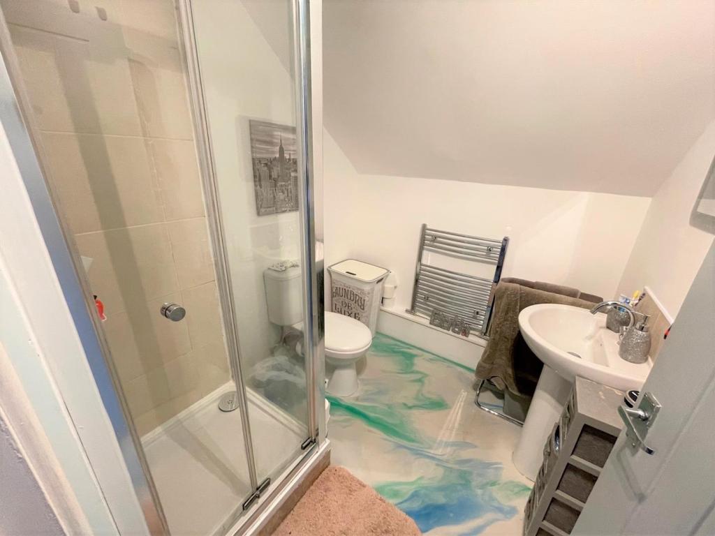 EN-SUITE. Three piece suite in white with chrome fittings incorporating shower cubicle, pedestal wash hand basin, low level w.c. chrome heated towel rail.