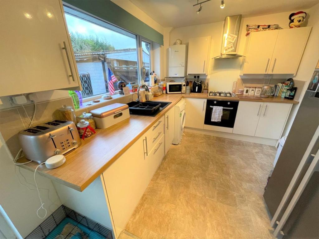 DINING KITCHEN. 16’7″ X 10’8″ APPROX. Range of base and wall units in high gloss cream with chrome fittings, worktops, oven/hob, spot lighting, single drainer sink with mixer taps, part tiled walls, plumbed for automatic washing machine, laminated flooring, central heating boiler, double glazed window and door to rear, central heating radiator.