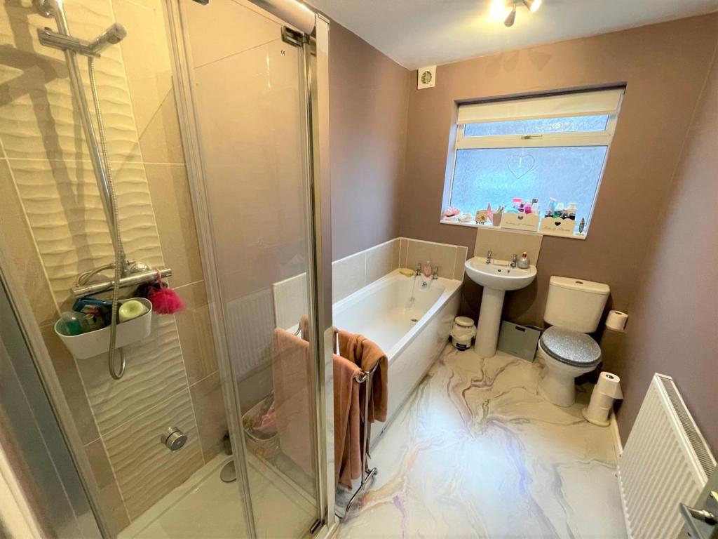 BATHROOM. Four piece suite in white with chrome fittings incorporating panelled bath, shower cubicle, pedestal wash hand basin, low level w.c. spot lighting, part tiled walls, central heating radiator, double glazed window to side.
