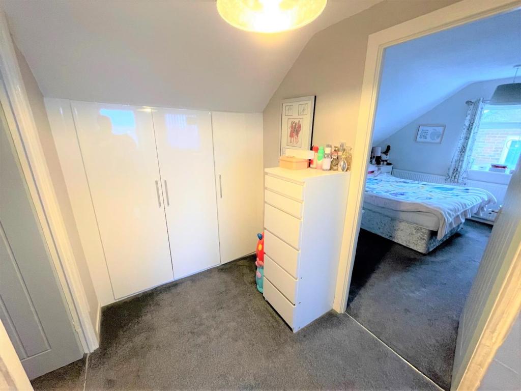 BEDROOM 3. 12’5″ X 8’11” APPROX. Fitted wardrobes in white with chrome fittings, central heating radiator, double glazed window to side.