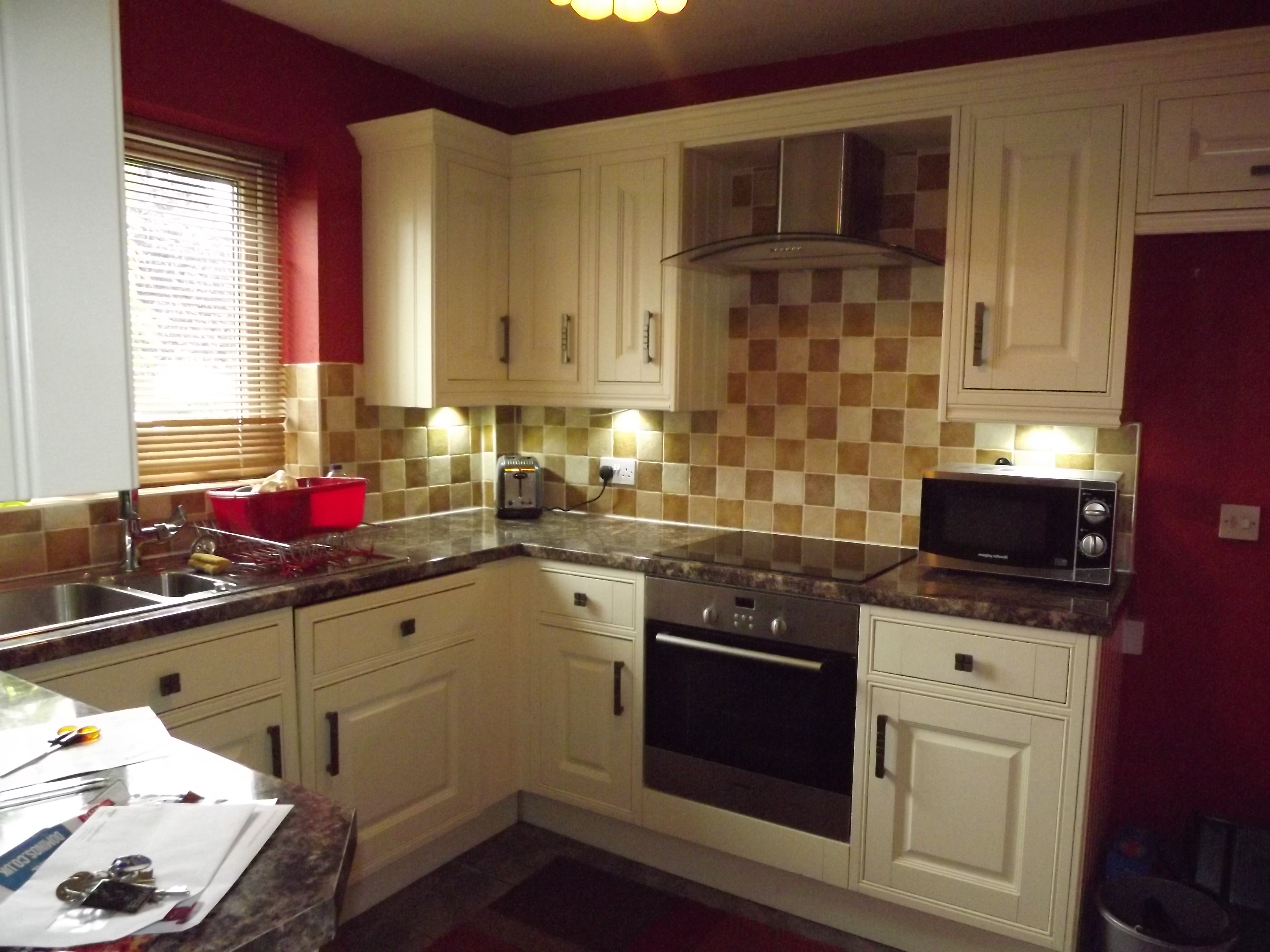 KITCHEN. 9’11” X 7’7” APPROX. Range of base and wall units in Cream with Chrome fittings, worktops, oven/hob, extractor hood, single drainer stainless steel sink unit with mixer taps, plumbed for automatic washing machine, dishwasher, part tiled walls, double glazed window to front.
