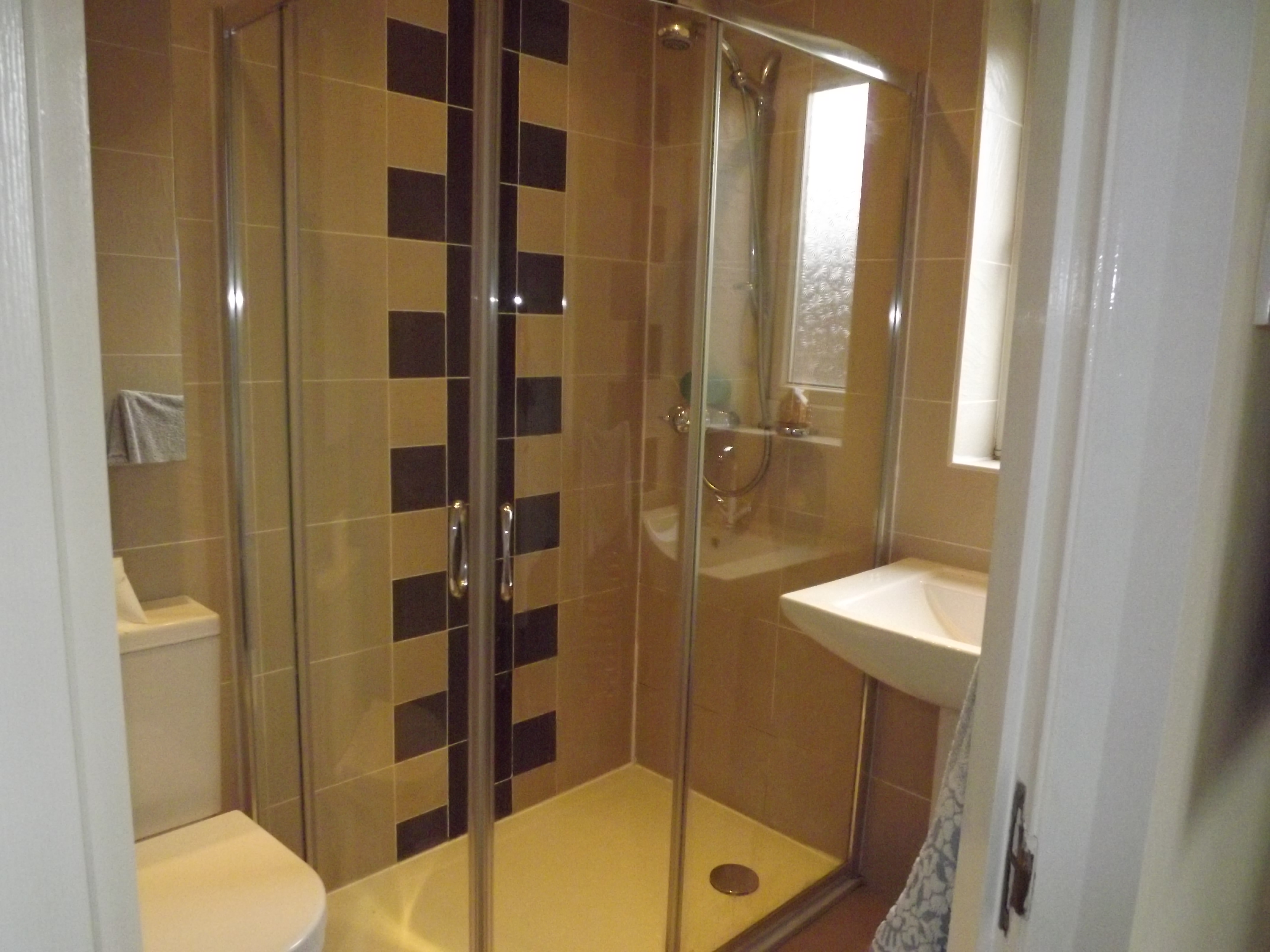 EN-SUITE. Three piece suite in White with Chrome fittings incorporating shower cubicle, pedestal wash hand basin, low level w.c, fully tiled walls, extractor fan, spot lighting, Chrome heated towel rail.