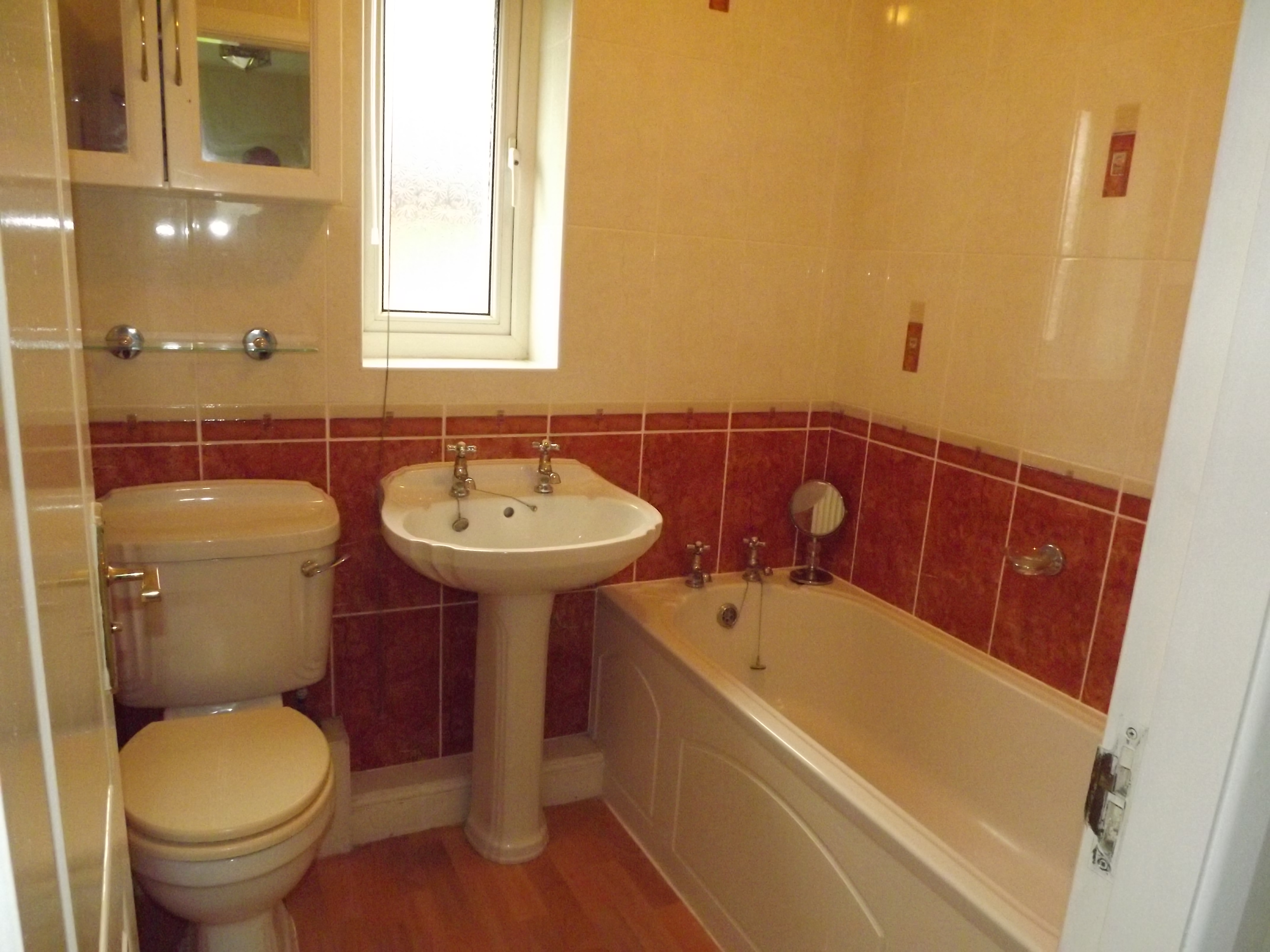BATHROOM. Three piece suite in White with Gold/Chrome fittings incorporating, panelled bath, pedestal wash hand basin, low level w.c, fully tiled walls, central heating radiator, double glazed window to side.