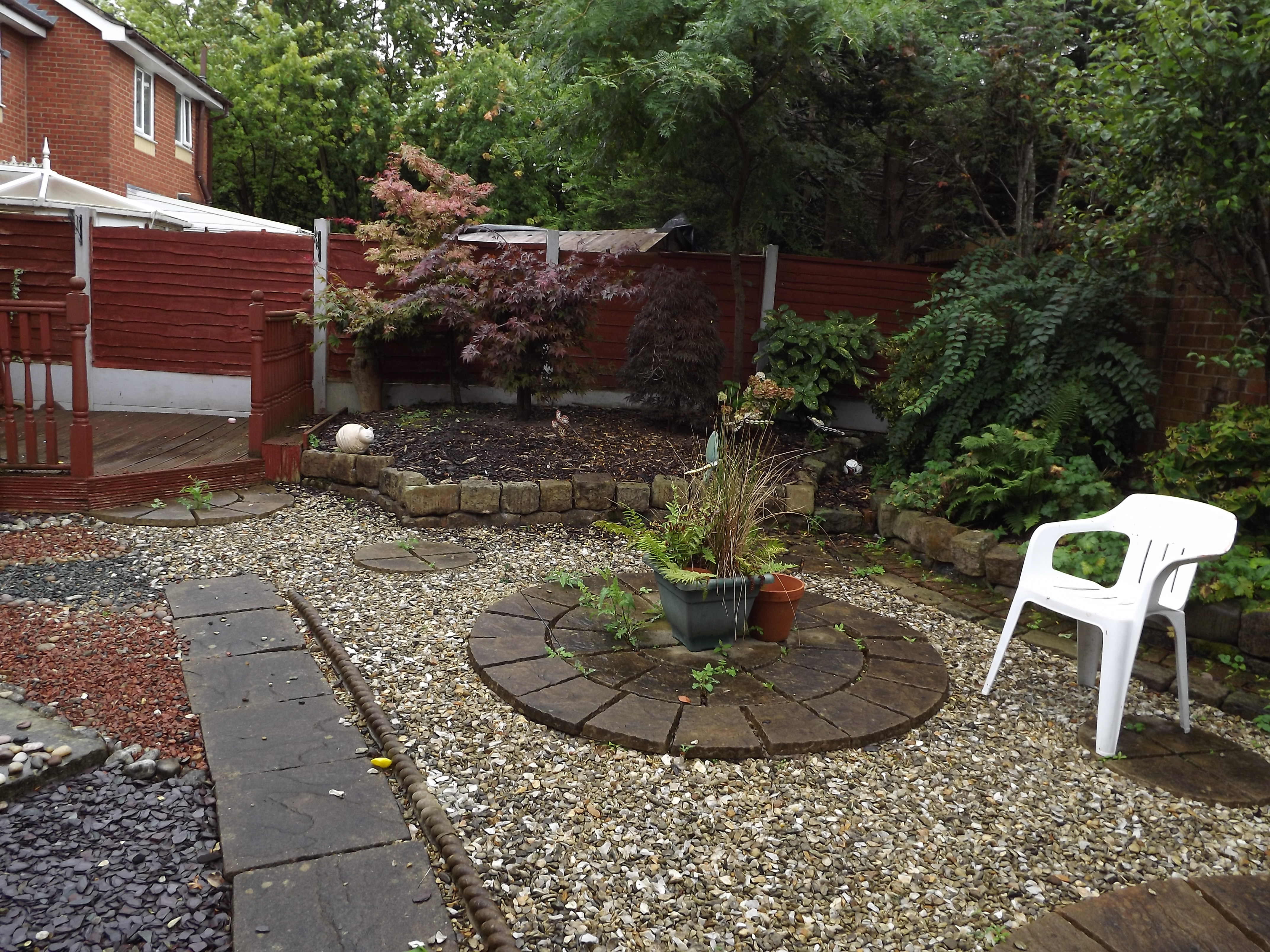 GARDENS. Shrubs and flower areas to front, flagged and pebbled garden to rear with raised patio decking.