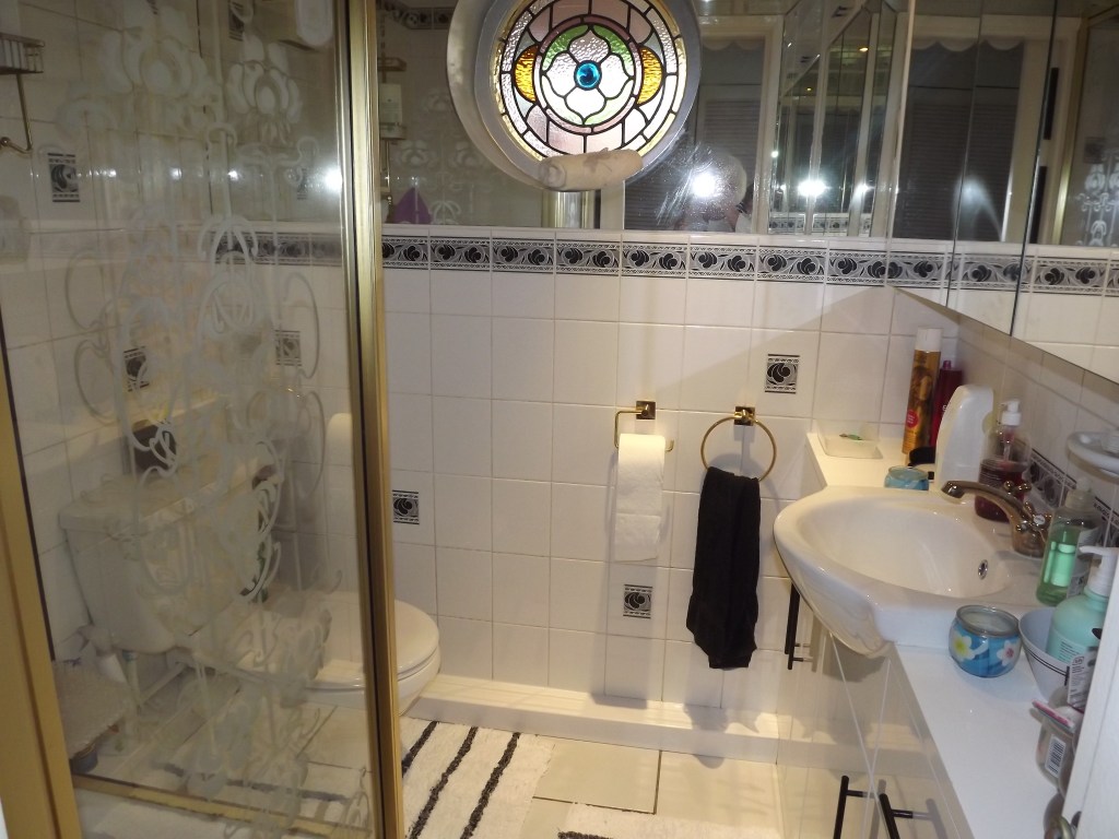 DOWNSTAIRS SHOWER ROOM. Three piece suite in White with Chrome fittings incorporating, shower cubicle, vanity unit/storage with wash hand basin, low level w.c, fully tiled walls, ceramic tiled floor, upvc panelled ceiling with spot lighting, central heating radiator, circular leaded and stained glass window.
