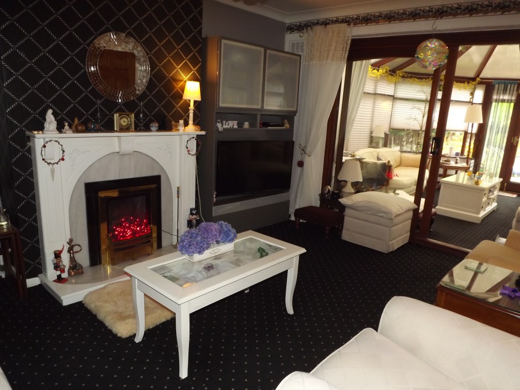 LOUNGE. 15’10” X 11’0” APPROX. Adam style fireplace with living flame coal effect gas fire inset, Marble hearth, coved ceiling, central heating radiator, double glazed patio doors to conservatory, sliding doors into dining room.