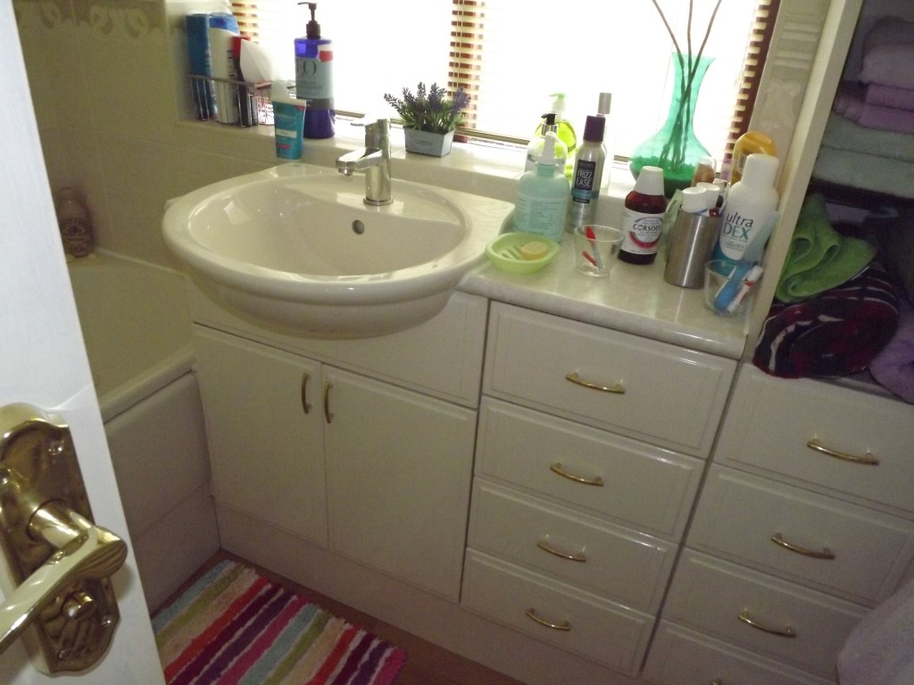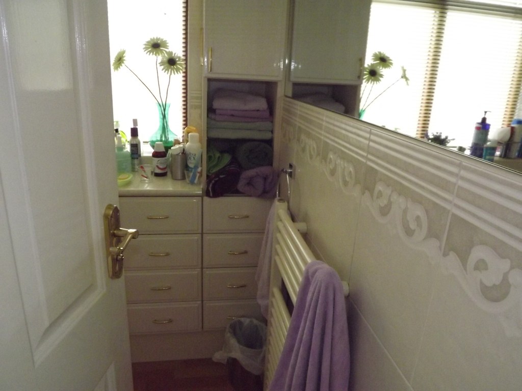BATHROOM. Two piece suite in White with Chrome fittings incorporating, Jacuzzi bath with shower over bath, folding shower screen, storage in High Gloss White with wash hand basin, UPVC panelled ceiling with spot lighting, fully tiled walls, central heating radiator, double glazed window to rear.