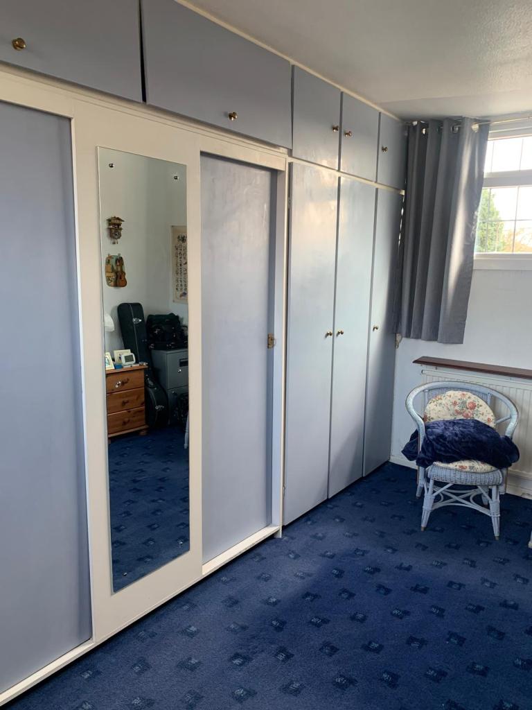 BEDROOM 2. 14’8″ X 7’10” APPROX. Fitted wardrobes in Blue, coved ceiling, central heating radiator, double glazed windows to front and rear.