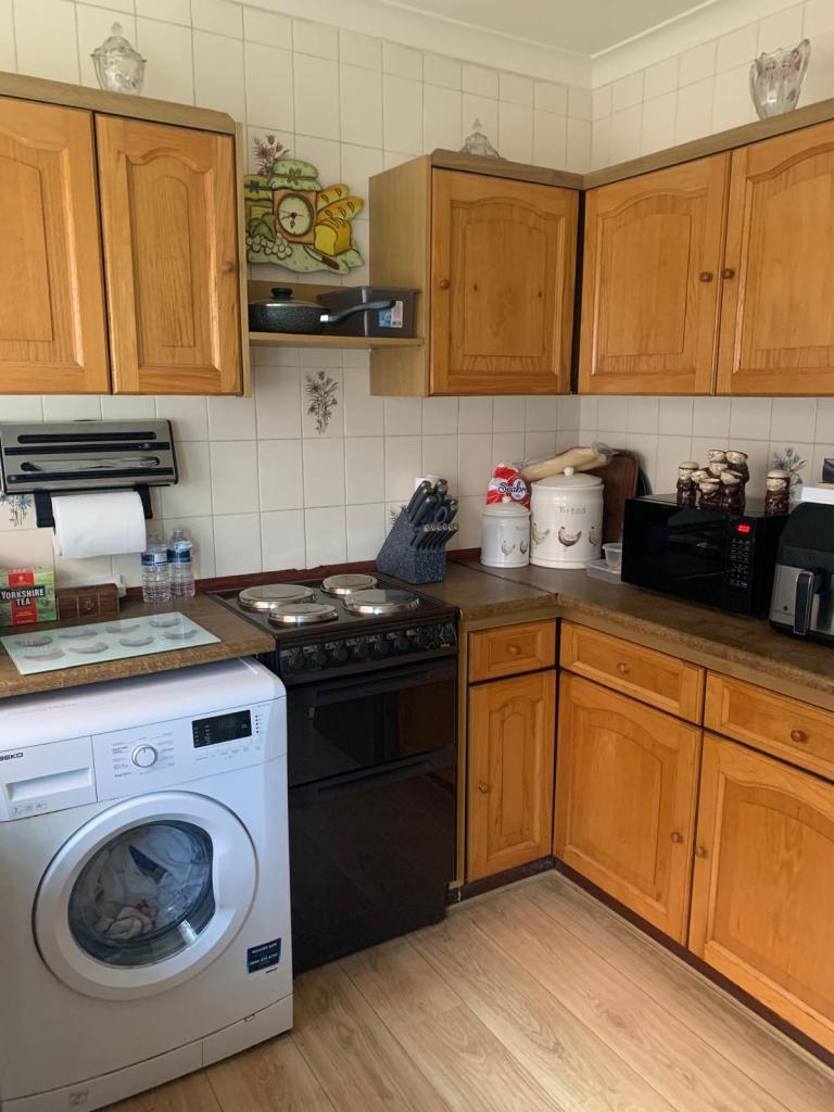 KITCHEN. 8’8″ X 8’4″ APPROX. Range of base and wall units in Medium coloured wood, worktops, single drainer stainless steel sink unit, plumbed for automatic washing machine, part tiled walls, central heating radiator, double glazed window and door to side.
