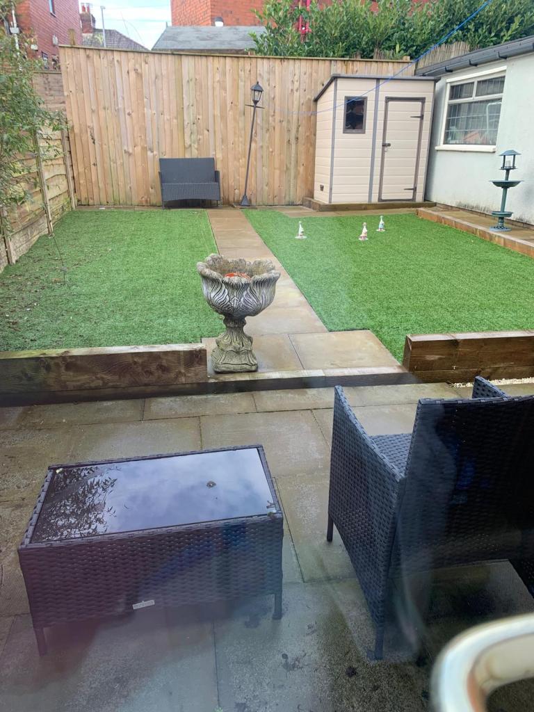 GARDENS. Artificial grass lawn to front and rear with shrubs and flower areas, fully flagged drive to side leading to detached garage with remote controlled door, garden shed, fully fenced for privacy, patio.