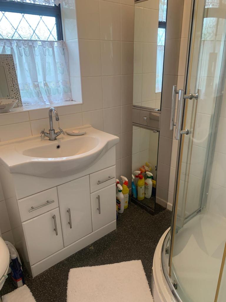SHOWER ROOM. Three piece suite in White with Chrome fittings incorporating, shower cubicle, vanity unit with wash hand basin, low level w.c. fully tiled walls, central heating radiator, double glazed window to rear.