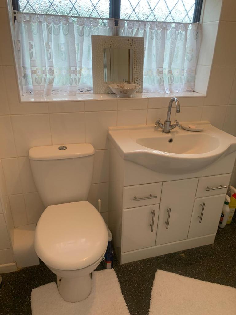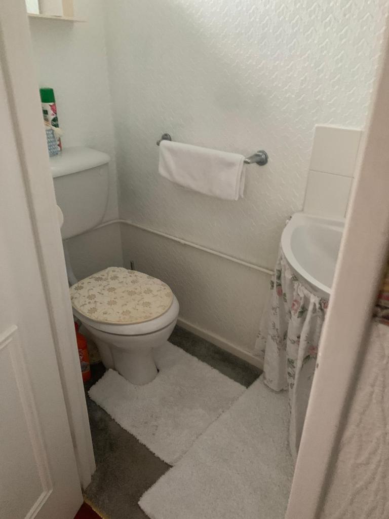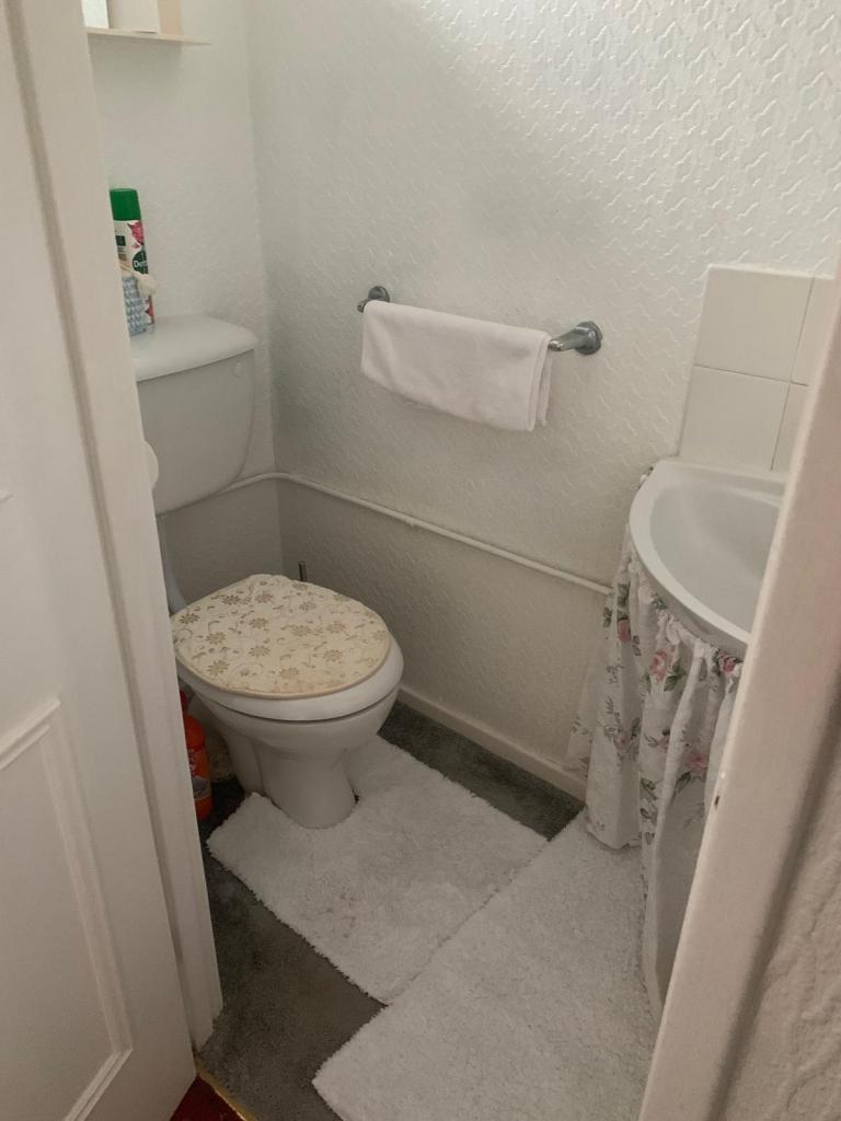 DOWNSTAIRS CLOAKS/W.C. Two piece suite in white with chrome fittings, incorporating wash hand basin, low level w.c. coved ceiling, central heating radiator.