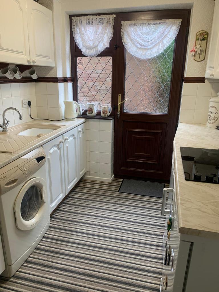 KITCHEN. 12’2” X 6’5”APPROX. Range of base and wall units in White, worktops, double oven, Halogen hob, plumbed for automatic washing machine, part tiled walls, storage cupboard, double glazed window and door to rear.